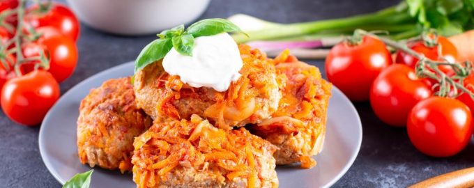 Roer alles door elkaar zodat het mengsel goed aan elkaar blijft plakken. Als het uit elkaar valt, klop er dan een extra ei door. Vorm met natte handen de gevulde kool, doop in bloem en bak in olie tot ze aan beide kanten bruin zijn. Doe ze in een steelpan met dikke bodem. Meng tomatenpuree met zure room en voeg heet water toe tot de saus op vloeibare kefir lijkt. Kruid het met kruiden en giet het over de gevulde kool. Als de saus de kool niet voor 90% bedekt, voeg dan meer water toe.
