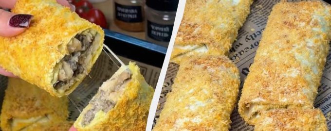 Combineer het vlees en de champignons in een braadpan, giet de bloem erbij, roer, zout, giet de room erbij en rasp de nootmuskaat. Roer met een spatel en kook tot de room verdampt is. Leg een vel lavash op tafel, leg de vulling van kip en champignons erin en leg er geraspte kaas naast. Rol de pita op tot een envelop, bijna zoals een shoarma, wentel in eigeel en panko paneermeel. Leg de julienne in pita op een bakplaat bekleed met bakpapier en bak 15 minuten in een voorverwarmde oven op 180 graden.